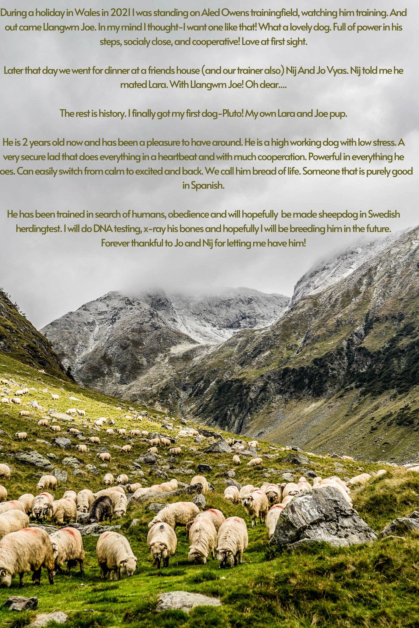 Under en utflykt till Wales hösten 2021 mötte jag en väldigt trevlig hane hos Aled Owen. Vi var där och fick vara med vid träning av hundar i olika åldrar. Ut kom då Joe som han heter. En sån skulle jag vilja ha, tänkte jag. Vilken härlig hund! Kraftfull, tillgänglig och samarbetsvillig.